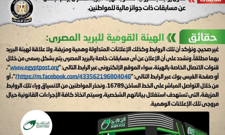 تداولت بعض المواقع الإلكترونية وصفحات التواصل الاجتماعي روابط إلكترونية منسوبة لهيئة البريد المصري بزعم الإعلان عن مسابقات ذات جوائز مالية للمواطنين، وقد قام المركز الإعلامي لمجلس الوزراء بالتواصل مع الهيئة القومية للبريد المصري، التي نفت تلك الأنباء، مُؤكدةً أنه لا صحة لهذه المسابقات، وأن تلك الروابط وكذلك الإعلانات المتداولة وهمية ومزيفة، ولا علاقة لهيئة البريد بهما مطلقاً، مشددةً على أن الإعلان عن أي مسابقات خاصة بالبريد المصري يتم بشكل رسمي من خلال قنوات الاتصال الخاصة بالهيئة، سواء الموقع الإلكتروني عبر الرابط التاليwww.egyptpost.org””، أو صفحة الفيس بوك عبر الرابط التالي: “https://m.facebook.com/433562196804046/”، أو من خلال التواصل المباشر على الخط الساخن 16789، محذرةً المواطنين من الانسياق وراء تلك الروابط المزيفة، التي تستهدف استغلال بياناتهم الشخصية، وسيتم اتخاذ كافة الإجراءات القانونية حيال مروجي تلك الإعلانات الوهمية.