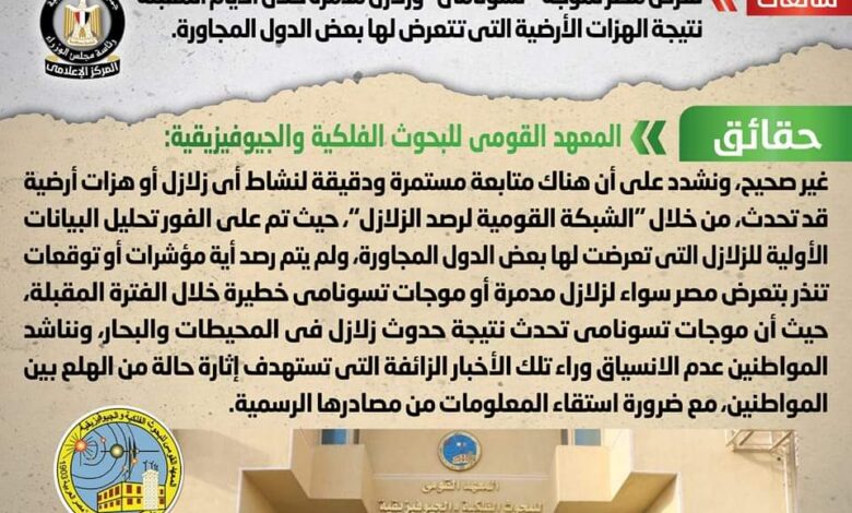 تداولت بعض المواقع الإلكترونية وصفحات التواصل الاجتماعي أنباء بشأن تعرض مصر لموجة “تسونامي” وزلازل مدمرة خلال الأيام المقبلة بعد الهزات الأرضية التي تتعرض لها بعض الدول المجاورة، وقد قام المركز الإعلامي لمجلس الوزراء بالتواصل مع المعهد القومي للبحوث الفلكية والجيوفيزيقية، والذي نفى تلك الأنباء، مُؤكداً أنه لا صحة لتعرض مصر لموجة “تسونامي” وزلازل مدمرة خلال الأيام المقبلة نتيجة الهزات الأرضية التي تتعرض لها بعض الدول المجاورة، مُشدداً على أن هناك متابعة مستمرة ودقيقة لنشاط أي زلازل أو هزات أرضية قد تحدث، من خلال “الشبكة القومية لرصد الزلازل”، حيث تم على الفور تحليل البيانات الأولية للزلازل التي تعرضت لها بعض الدول المجاورة، ولم يتم رصد أية مؤشرات أو توقعات تنذر بتعرض مصر سواء لزلازل مدمرة أو موجات تسونامي خطيرة خلال الفترة المقبلة، حيث أن موجات تسونامي تحدث نتيجة حدوث زلازل في المحيطات والبحار، مُناشداً المواطنين عدم الانسياق وراء تلك الأخبار الزائفة التي تستهدف إثارة حالة من الهلع بين المواطنين، مع ضرورة استقاء المعلومات من مصادرها الرسمية.