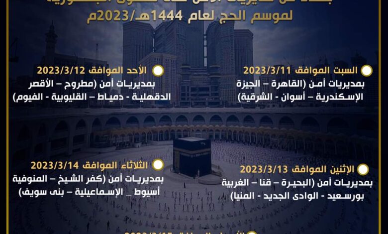 تقرر البدء فى إجراء قرعة الحج بمديريات الأمن على مستوى الجمهورية فى إطار تفعيل الإجراءات التنفيذية لتنظيم قرعة الحج هذا العام ١٤٤٤هـ/٢٠٢٣م ، وذلك خلال الفترة من يوم السبت الموافق ٢٠٢٣/٣/١١ وحتى يوم الأربعاء الموافق ٢٠٢٣/٣/١٥ .. على النحو التالى: