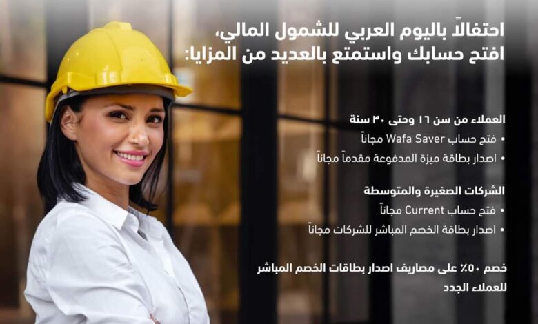 أعلن بنك التجاري وفا ايجيبت عبر صفحته الرسمية على موقع التواصل الاجتماعي فيسبوك عن أحدث عروضه للعملاء، حيث يتيح البنك فتح حسابات مجانية تزامنا مع الاحتفال باليوم العربي للشمول المالي.