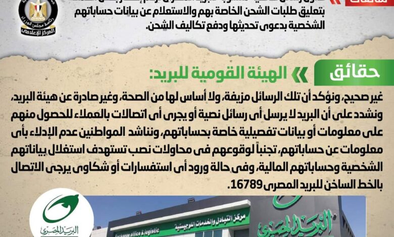 تداولت بعض صفحات التواصل الاجتماعي رسائل هاتفية منسوبة للبريد المصري تزعم إخطار بعض العملاء بتعليق طلبات الشحن الخاصة بهم والاستعلام عن بيانات حساباتهم الشخصية بدعوى تحديثها ودفع تكاليف الشحن، وقد قام المركز الإعلامي لمجلس الوزراء بالتواصل مع الهيئة القومية للبريد، والتي نفت تلك الأنباء، مُؤكدةً أنه لا صحة لإرسال البريد المصري أي رسائل هاتفية تزعم إخطار العملاء بتعليق طلبات الشحن الخاصة بهم والاستعلام عن بيانات حساباتهم الشخصية بدعوى تحديثها ودفع تكاليف الشحن، وأن تلك الرسائل مزيفة، ولا أساس لها من الصحة، وغير صادرة عن هيئة البريد، مشددةً على أن البريد لا يرسل أي رسائل نصية أو يجري أي اتصالات بالعملاء للحصول منهم على معلومات أو بيانات تفصيلية خاصة بحساباتهم، مُناشدةً المواطنين عدم الإدلاء بأي معلومات عن حساباتهم، تجنباً لوقوعهم في محاولات نصب تستهدف استغلال بياناتهم الشخصية وحساباتهم المالية، وفي حالة ورود أي استفسارات أو شكاوى يرجى الاتصال بالخط الساخن للبريد المصري 16789.