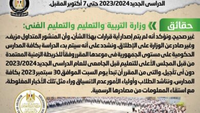 تداولت بعض المواقع الإلكترونية وصفحات التواصل الاجتماعي منشوراً يزعم تأجيل موعد بدء الدراسة بالمدارس للعام الدراسي الجديد 2023/2024 حتى 7…